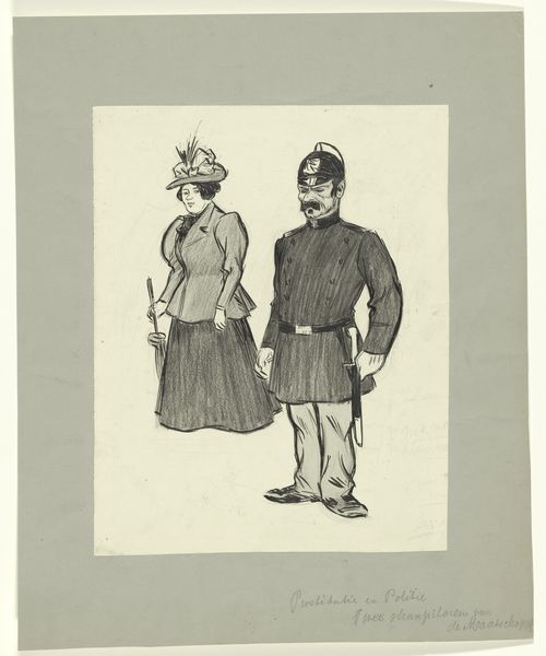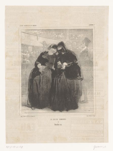 This print, "Twee modieuze mannen" or "Two fashionable men", was created by Paul Gavarni, though the exact date is unknown. Gavarni was a key figure in depicting Parisian life during a time of significant social change. The image captures a scene of intimate exchange, yet it raises questions about visibility and exclusion. What secrets are shared between these men, and who is privy to this exchange? The artwork hints at the codes of masculinity and the performance of social status. It reflects the era's fascination with fashion as a marker of identity and belonging, and the way in which clothing and posture signaled one’s position in society. Gavarni's work provides a glimpse into a world defined by appearances and unspoken rules. There is an emotional tension to the artwork as the viewer is kept at a distance, only able to imagine the nature of the exchange and its impact on the individuals involved.