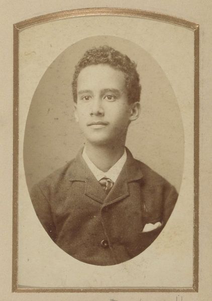 Curator: Walking through the Rijksmuseum galleries, we find ourselves drawn to "Portret van (vermoedelijk) een Surinaamse jongen," a gelatin-silver print realized sometime between 1883 and 1895, attributed to Franz Reissig. What strikes you most when you first look at it? Editor: The stillness. He’s so young, and there’s this incredible seriousness in his expression. It’s more than just posing for a portrait; there’s a quiet intensity, almost a stoicism. The tones add to that, a sort of hushed sepia, muting any exuberance. Curator: It's certainly a very thoughtful study in composure. Reissig, working within the tradition of realist portraiture, presents the boy with dignity. Note how the oval frame further concentrates our gaze upon his features, directing attention to his gaze and, therefore, towards his inner world. Editor: And he’s dressed so formally, with the tie and jacket—yet, there’s also something about his haircut, almost close-cropped, that feels starkly different, that doesn't entirely fit with that era’s presentation of bourgeois elegance. It's such a fascinating combination. Is it a reflection of assimilation perhaps? Or resistance? Or a bit of both? Curator: That's a wonderfully sensitive reading. In some ways, the lack of definitive context opens a space for speculation – his very identity marked as “vermoedelijk,” or “presumed,” highlighting the limited documentation around people of color in this historical period. It is through that symbolic void that the artwork transcends the individuality of its subject to speak for something collective: erasure and a reclaiming of identity. Editor: Precisely. Looking at it now, the very fact it hangs here is important. An act of bearing witness to a past often overlooked. You know, he almost becomes a stand-in for the stories untold. Curator: And it quietly invites the viewer to wonder and remember—about lives lived and histories yet to be fully understood. Editor: It’s a privilege to spend even just a few minutes considering it.