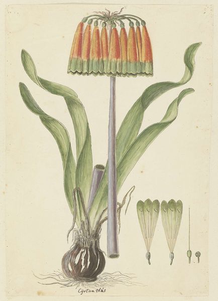 Curator: The delicacy of this drawing immediately strikes me. Robert Jacob Gordon, likely sometime between 1777 and 1786, captured this Sand-lily with what appears to be watercolor. It's really quite beautiful. Editor: I agree, there’s something both precise and strangely ethereal about it. The bulb feels grounded, even earthy, but then this cascade of blooms like some sort of floral chandelier emerges. What sort of materials were typically available for botanical studies in the late 18th Century? The paper itself tells a story. Curator: Certainly. You can see the fine strokes and blending indicative of high-quality brushes available, although it's fair to assume varying grades of paper influencing the pigment absorption at the time. The scientific endeavor met the capabilities of artisan crafting with paper and pigments. It all shaped botanical art! Editor: Speaking of shaping, look at how the artist uses the imagery. The droop of those salmon-pink blossoms reminds me a bit of funerary art, strings of teardrops almost. There's an element of mourning embedded perhaps? Given that this piece captures detail suitable for the burgeoning field of taxonomy, how do the symbolism of flowers integrate with emerging natural sciences? Curator: I wonder if he perhaps did the sketches "en plein air" given the tags on the object. It lends credence to a field based method and perhaps it speaks more to immediate representation. Editor: Even if drawn "en plein air," there’s no reason the cultural language surrounding flowers at the time wouldn’t seep into Gordon’s aesthetic choices. Color carries such weight—the muted green leaves juxtaposed with these almost flesh-toned petals. What stories were attached to that colour in the cultural mind? Curator: That's a point. Though to understand it fully, perhaps looking at the pigment analysis might unlock other cultural implications relating to commerce. Did that hue come at great cost? Where were its components sourced from? Editor: Always back to production, eh? It's a fair point, actually. It pushes me to question, What did it cost to see beauty this way? Curator: It’s not just cost! Understanding material practices grounds what sometimes drifts into heady interpretations of intent. Editor: An insightful complement – looking again it opens another world and this helps to reconsider its legacy, I appreciate it!
