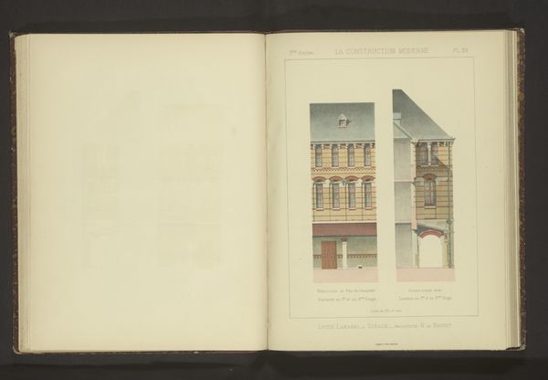 These are reproductions of three drawings of the Lycée Lakanal in Sceaux, France, made by Paul Dujardin, dating from the late 19th or early 20th century. The drawings are characterized by their meticulous detail and structured composition. Notice the tripartite division of the facade, segmented almost like a triptych. Each section offers a slightly different perspective or detail, yet they are unified by a consistent use of line, color, and scale. The drawings present a formal study in architectural representation, focusing on the interplay between elevation and perspective. The use of precise lines and flat colors lends a graphic quality to the images. This reflects a broader movement towards rationalism and scientific observation in architectural design. It almost functions as a semiotic system where each line and plane serve as signs that combine to communicate the underlying structure of the building. Consider how the artist uses repetition and variation to destabilize a singular viewpoint. The drawings invite us to question how we perceive and represent architectural space.