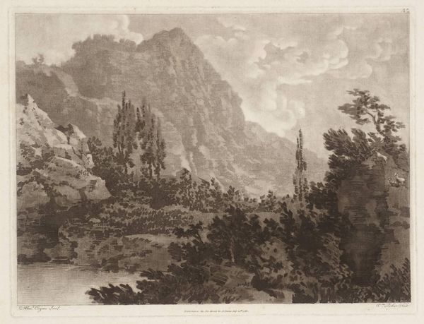 Hendrik Schwegman created this print of the Waterval van Gavarnie, or Gavarnie Falls, using etching, a printmaking technique, during a time of significant political and social upheaval in Europe. As the Enlightenment ideals spread, so did the public's interest in natural landscapes, aligning with emerging notions of freedom and individualism. This etching captures the grandeur of the Pyrenees, but also subtly incorporates elements of everyday life. Note the figures in the foreground; they invite us to reflect on the relationship between humanity and nature. Are they merely observers, or are they part of this landscape? Schwegman situates us within a narrative that intertwines personal experience with broader societal themes, challenging us to consider our own place within the natural and social world. This interplay encourages viewers to reflect on their own identities and histories in relation to the world around them.