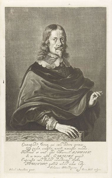 Editor: This is Robert van Voerst’s portrait of Philip Herbert, the 4th Earl of Pembroke. It’s quite striking, with all the detail in the lace and fabric. What symbols do you see here? Curator: The most prominent symbol is the starburst emblem he wears. That’s the insignia of the Order of the Garter, charged with chivalry, a kind of cultural memory of noble virtues. See how it dominates the composition? Editor: Yes, it’s very eye-catching. So, he is literally wearing his honor? Curator: Precisely! The lace also suggests status, and his pose suggests self-possession and a hint of melancholy. These were all potent signifiers. Editor: I hadn't thought about his pose telling a story. Thanks! Curator: A single object, carefully chosen, can tell us so much about a person and an era.