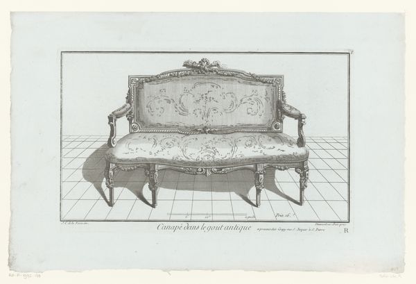 Curator: Well, this engraving really takes me back. What's your initial read? Editor: Austere, yet flamboyantly contained! There’s such an obvious contrast between the clean lines of the printmaking and the curvy extravagance of that sofa. Makes me wonder, who designed something so committed to ornate relaxation? Curator: The Rijksmuseum identifies this work as "Bank met drie zittingen", or a "Bench with three seats," rendered sometime between 1745 and 1775 by an anonymous hand. Its creation involved both drawing and engraving techniques on paper. But to your point, look closely. See the subtle but significant Rococo flair—that distinctive emphasis on elegance through curves and floral motifs. Editor: The floral accents are a delightful paradox. Like tiny explosions of summer tamed by the black and white lines. Do you get a feeling that the artist intended to represent some hidden order to nature, and its chaotic beauty, so prevalent in the art of furniture design in that epoch? Curator: Precisely! It's an expression of harmony in tension—nature's exuberant expression harnessed within carefully controlled lines and forms, as it's an embodiment of its time. These forms signify social status and elaborate aesthetic values. The sofa doesn't merely serve as seating. It symbolizes cultivated refinement. It presents itself, visually, as an almost theatrical stage. Editor: Yes! Imagine the conversations it has hosted—or better yet, the secrets it has absorbed. It really is more than mere decorative art! It makes me feel almost melancholic about our modern furniture trends; so streamlined, so... devoid of whispered secrets! Curator: We've really peeled back some symbolic layers here. It's been quite the visual excavation, hasn't it? Editor: Indeed! This bench certainly prompts us to sit and ponder the conversations of eras past. What stories are held, perhaps silently and invisibly, within forms of art.