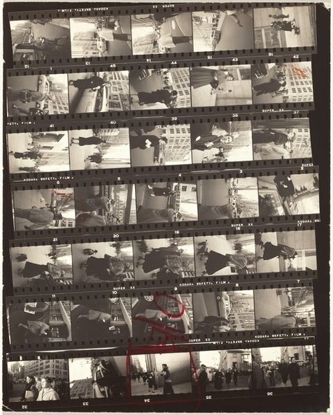 Editor: Here we have Robert Frank's gelatin silver print, "Embarkation--New York City V," created in 1955. The format, a contact sheet, gives the piece a rather raw, almost documentary feel, as if we’re peering into the photographer's process. I am intrigued by the overall mood: A combination of detachment, a little chaos, a celebration perhaps tinged with an unknown melancholy? How do you see this collection of images interacting? Curator: That's a very perceptive reading, considering the context surrounding Frank's work. These images weren't originally presented as a cohesive artwork in this form; they are outtakes, really. But the very act of presenting this contact sheet, the artist's process laid bare, speaks volumes about the post-war social and cultural landscape. How do you think the display of raw process, in and of itself, reshapes what is considered to be art? Editor: Well, by seeing these preliminary and less formally perfect photos, does it try to breakdown art's supposed perfection, almost making it more democratic by allowing a broader range of visuals that society may see and be impacted by? Curator: Precisely. Frank, through his entire project 'The Americans', challenged established norms of photography and social representation. Displaying a contact sheet pushes this boundary. It invites viewers to engage critically not just with the images themselves, but with the very machinery of image-making and its relationship to truth and social narratives. What kind of power is on display, through these selected images? Who has control over it? Editor: Hmm, so maybe it points at a shift where everyday experiences become legitimate subjects for artistic exploration? Curator: Exactly! And by doing so, he gives agency back to people previously unacknowledged. These fragmented glimpses capture New York's dynamism but also reveal a certain disaffection, mirroring a society undergoing immense transformations and reassessing its own values. These seemingly random images tell the tale. Editor: It's fascinating to consider how the presentation of something – even the outtakes – can alter its meaning and influence the observer. Curator: Indeed. Robert Frank’s outtakes can have as powerful effect, as an anthropologist displaying what normally goes unseen or unsaid. Thanks, I’ve learned something new. Editor: Agreed, thanks for sharing. This reminds me about questioning perspectives in our contemporary cultural production!