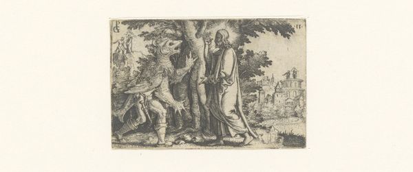 Curator: This is William Blake's engraving, "Colinet Mocked by Two Boys, from Thornton's 'Pastorals of Virgil,'" created in 1821. It's currently held at the Metropolitan Museum of Art. Editor: The scene has a rather unsettling quality to it. There's something about the sharp contrasts and the stylized figures that makes me feel uneasy, despite the seemingly pastoral setting. It is very rough hewn isn't it? Curator: That's partly attributable to Blake's radical approach to illustration, rejecting the prevailing Neoclassical aesthetics of the time. Blake sought to express a deeper, almost mystical understanding of Virgil’s text through an emphasis on stark contrasts and a more folk-art sensibility. These engravings for Thornton reflect Blake's social critique of elitism and the exploitation of labor, the mockery itself becoming symbolic of power dynamics. Editor: The raw quality of the engraving really does emphasize that. Look at the heavy lines, the way the figures are almost crudely rendered, it feels almost purposefully defiant of refined taste. Were these illustrations not well received at the time because of their execution? Curator: Indeed, the illustrations were widely criticized during that period. Blake aimed to disrupt conventions and connect directly with a simpler, uncorrupted mode of vision. We can think about this print in dialogue with contemporary discussions surrounding cultural appropriation and authenticity within Romanticism. Blake’s radical interpretations often led him into conflict with societal expectations, particularly regarding social hierarchies and accepted aesthetic standards. Editor: So it wasn't just about making art, but also about making a statement with his art. How the means by which art is produced reflects his ideological stand-point. Did this defiance influence his printing process itself? What about his choice of materials, compared with other more luxurious artworks from his time? Curator: Absolutely, it did influence his methods profoundly. By using materials accessible to a broader demographic, Blake challenged the art establishment and engaged with wider audiences, underscoring ideas that art should not exist solely within an exclusive realm. And of course Blake would also continue using this exact same visual language in later works. Editor: Ultimately, Blake’s art transcends his medium through the powerful connection between materiality and messaging, offering both critical insights into societal constructs and aesthetic rebellions of convention, creating artworks far greater than they at first may seem. Curator: Precisely. Blake utilized visual storytelling to dismantle notions of social superiority while fostering intellectual discourse concerning themes of authenticity, justice, and inclusivity that continue to remain applicable today.