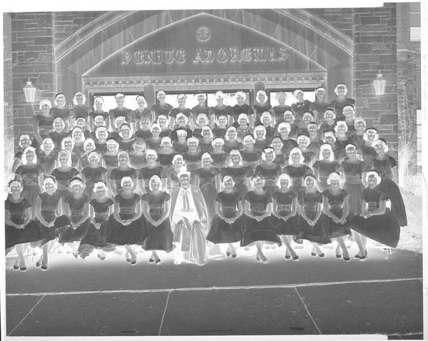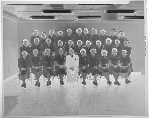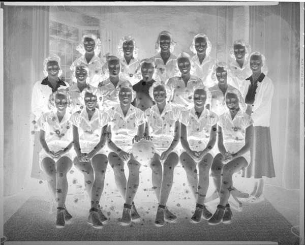 Curator: This intriguing photograph, currently held in the Harvard Art Museums, is titled "Untitled (class of girls in gym clothes)" by John Deusing. The exact date remains unknown. Editor: It's striking. There's a regimented quality to the composition, like a factory churning out…girls. The stark contrast in the photograph certainly emphasizes that. Curator: Precisely. The image presents a study of young women in a structured, almost institutional setting. The uniformity of the attire and the arrangement hint at the social expectations placed upon women during that time. Editor: The gymnasium itself—the backdrop—plays a crucial role here. What were the materials used in its construction, and how does the architecture reinforce societal norms surrounding physical activity and gender? Were these garments factory made? Curator: Those are valid material considerations. We have to acknowledge how those factors shaped their lives within the larger narrative of female education and social conditioning. Editor: It leaves me with a sense of both admiration and unease. Curator: A fitting response, I think, given the complex layers at play.
