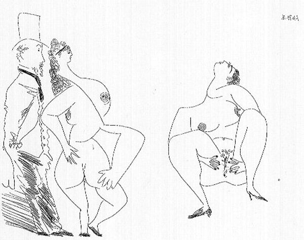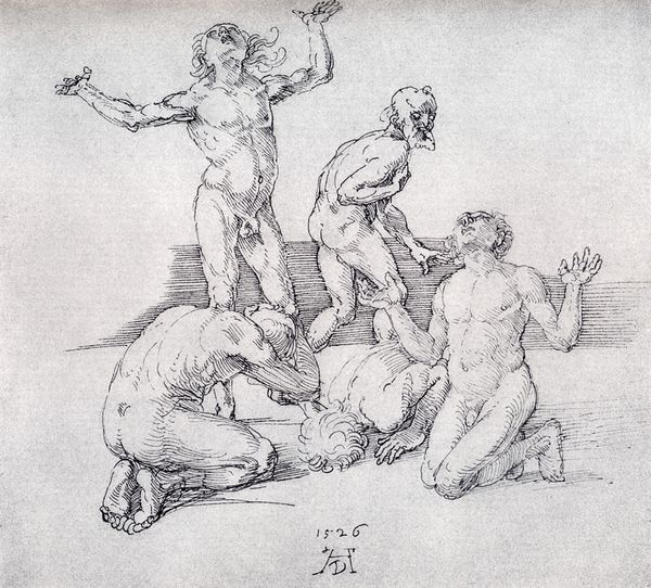 Editor: Here we have Picasso's "Minotaur is Wounded," created in 1933 using graphite and ink. The stark contrast of the black ink against the white background gives it a real sense of drama. The figures almost seem to be bursting out of the frame. What structural elements do you find most compelling in this piece? Curator: The potency of this piece resides precisely in the economy of means employed. Note how Picasso exploits the linear quality of the ink to define form and space. The dense, chaotic scribbles that describe the crowd contrast starkly with the more refined, flowing lines used for the figures of the Minotaur and his aggressor. This dichotomy creates a visual tension that mirrors the thematic conflict. Editor: So the application of the medium reinforces the narrative? Curator: Precisely. Further, observe the composition. The scene is almost entirely devoid of background. All focus is directed to the interplay between the figures and the act that is transpiring. There's a sense of immediacy, almost claustrophobia, created by the close framing and the density of the lines. Do you notice how this absence affects your reading? Editor: Definitely. It heightens the feeling of being a spectator to something intense and private. It's less about the context and more about the pure emotional exchange. Curator: An astute observation. The success of the work, formalistically speaking, hinges on how those stark choices elevate the symbolic violence to something of greater artistic import. Editor: I see what you mean. The limitations he imposes become the very strengths of the composition. Curator: Exactly! By analyzing the line and composition, the piece allows us a new appreciation of form and narrative. Editor: This exploration highlights how essential each artistic choice can be in delivering impact, something I will bear in mind. Thanks for illuminating the structural choices within the work!