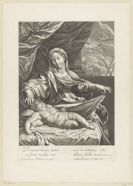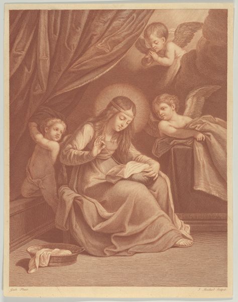 Curator: This print, titled "Te Deum Laudamus," was created between 1765 and 1769 by Robert Strange. It's an engraving after a painting by Carlo Maratta. What are your first thoughts when you see it? Editor: Honestly? A bit theatrical, in a baroque kind of way. It feels like a very posed, carefully constructed moment, all about the Virgin and these adoring angels. Is she... singing? Curator: The "Te Deum" is a hymn, a song of praise, so it fits thematically. Robert Strange was quite skilled at translating the grand historical narratives favored in academic art into print. This piece exemplifies the era's artistic values; a moment of reverence, elevated by Mary's presence. There is an undeniable aesthetic that upholds religious themes during this period. Editor: It’s interesting how the engraving transforms the texture. The angel with the harp looks rather stiff, and almost a little sad if I am honest. But it has an old-world charm. I mean, you can almost hear the echo of those high, soprano voices and smell the incense, and perhaps there's also that faint, musty scent of antique paper... like a treasured, albeit slightly neglected, hymn book. Curator: Certainly. And the very act of making this available through print had its own set of meanings. This makes previously inaccessible paintings accessible to a wider audience; this speaks volumes of its significance as a cultural artifact. Did this accessibility translate to greater public understanding and, if so, what kind of social impact might it have had? Editor: I suppose it could give individuals agency through owning images like these in the comfort of their homes, almost like owning religious icons, but at a much lower cost. Also, I really dig that he turned painting to print in a unique manner that brings this piece to life. What is your greatest take away about this print? Curator: It reminds us of the complex ways art functioned in the 18th century, straddling devotional and decorative spheres while shaping our understanding of historical narratives. Editor: Agreed. It's a powerful echo from the past, resonating in the silence of the museum with that baroque flamboyance still somewhat audible centuries later.