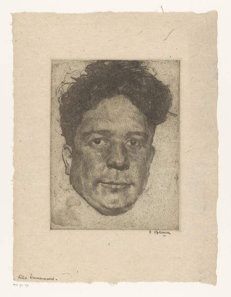 This is Willem Witsen's photograph of the writer and poet Willem Kloos. The portrait's formal structure is striking; the close-up composition and subdued sepia tones create an intimate yet melancholic atmosphere. Kloos's gaze meets ours directly, yet his expression is enigmatic, framed by disheveled hair and a somewhat blurred focus, adding to the portrait's introspective quality. Witsen's technique is particularly interesting in how it destabilizes traditional portraiture. Rather than aiming for sharp clarity and idealized representation, he employs a soft focus and tonal ambiguity, challenging conventional notions of beauty and likeness. We can see this reflected in the broader artistic and philosophical concerns of the time, particularly the Symbolist movement's interest in subjective experience and the exploration of inner states. The photograph functions as a sign, not just of Kloos's physical appearance, but of his persona as a poet, inviting us to contemplate the complex relationship between image, identity, and representation.