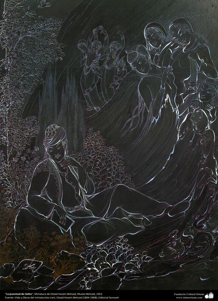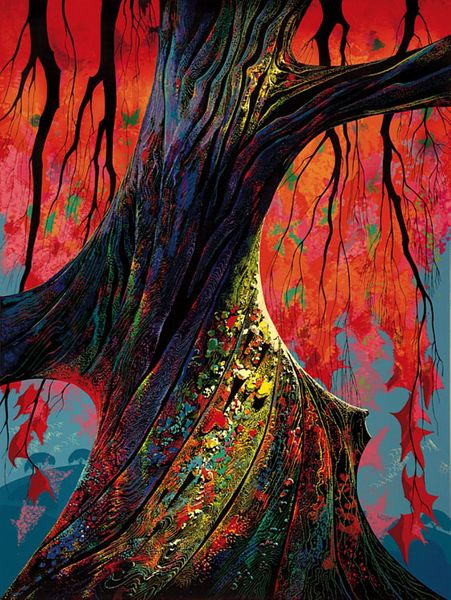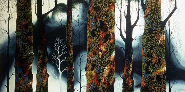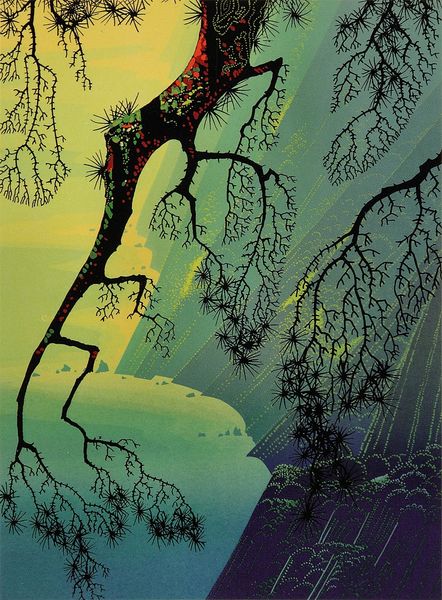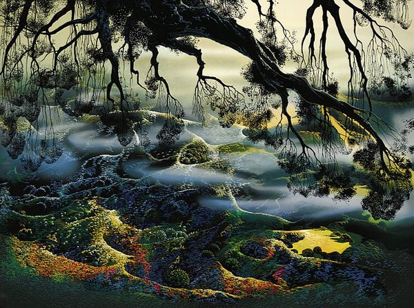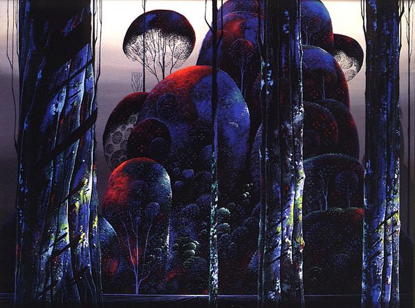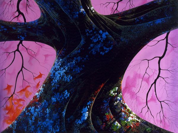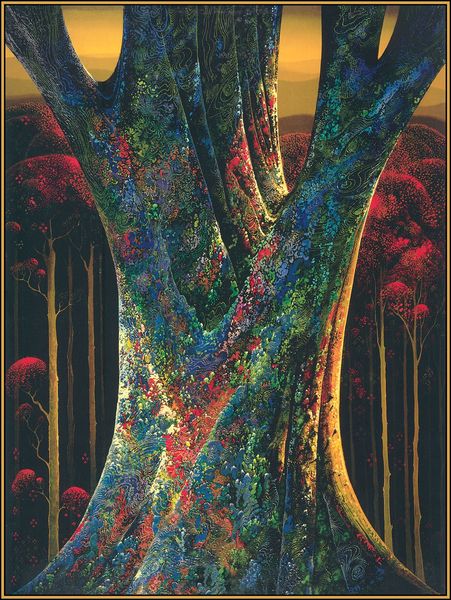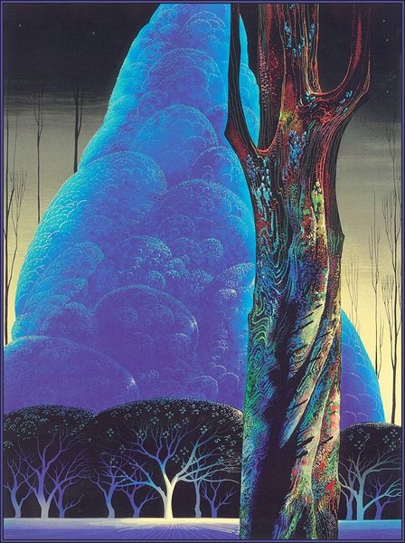 This is Eyvind Earle's "Jewel Tree." Earle, who died in 2000, was known for his distinctive style, often painting landscapes with a striking combination of realism and stylization. Look closely at the composition: the tree's massive trunk anchors the image, rising from darkness into a network of branches reaching skyward. Notice how the lines create a sense of depth and complexity. The artist’s use of color here is not merely decorative but structural. Blues and blacks dominate, punctuated by jewel-like tones on the trunk that gives the piece its name. The texture, seemingly smooth at first glance, reveals a meticulous layering of paint upon closer inspection. Consider how Earle uses light and shadow to define form, creating a captivating interplay between the familiar and the fantastical. This 'jewel tree' is not just a representation of nature; it is a carefully constructed visual experience, designed to evoke a sense of wonder and contemplation.