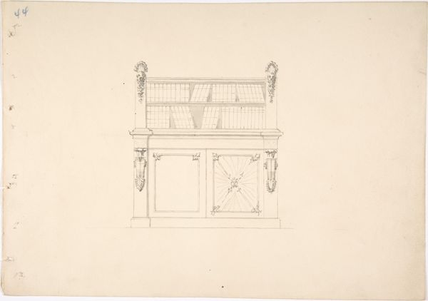 Editor: Here we have an intriguing design, "Design for a Gothic Style Corner Book Cabinet: Elevation and Plan," created between 1800 and 1850 by an anonymous artist. It's a mix of pencil, ink, etching, and possibly other media, detailing what looks like an architectural blueprint. What first jumps out is the sort of somber elegance; even as a sketch, the weight of historical and academic precedent is palpable. What symbolic elements stand out to you in this piece? Curator: The choice of Gothic style is deeply significant. Recall the Gothic period – associated with soaring cathedrals striving towards the heavens. This cabinet design appropriates that verticality, compressing it into a domestic setting. What psychological impact might that compressed aspiration have, do you think? Editor: Perhaps a constant, internalized striving for knowledge, made manifest in the domestic sphere? The books become a kind of personal cathedral. Curator: Precisely. Notice how the pointed arches, a signature of Gothic architecture, frame each shelf. They speak of enlightenment, of a gateway to knowledge. How does this contrast with the rise of Neoclassicism, another movement present at the time, with its own set of symbolism? Editor: Neoclassicism favored symmetry and order, a return to the 'rational' ideals of antiquity, didn't it? This design, while ordered, has a certain romantic flourish, a hint of medieval mystery absent from Neoclassical forms. Curator: Indeed. This drawing represents a fascinating tension between those aesthetic ideals. Look closely at the base - how do those curves at the corner relate to that overall verticality? Editor: Now that you mention it, that contrast in shapes feels like a struggle to reconcile groundedness with soaring intellect! I appreciate seeing the drawing as more than just a design for furniture; it really captures the intellectual climate of its time. Curator: And perhaps hints at the enduring human desire to find harmony between our earthly existence and our aspirational selves.