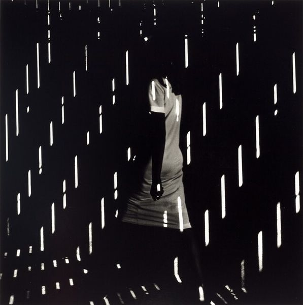 Curator: Looking at Ray Metzker’s black and white photograph, "Atlantic City," taken in 1966, the first thing I notice is the dramatic interplay of light and shadow. It's quite striking, wouldn’t you agree? Editor: Absolutely, it’s like being caught in a sudden downpour of light. The sharp contrast evokes a film noir atmosphere, and the anonymity of the figures contributes to an overall feeling of urban alienation. Curator: The long, almost staccato bars of light, give it a rather coded aesthetic. I find the contrast between those almost oppressive stripes and the faceless figure a signifier of being overwhelmed. It speaks to the disorienting, sometimes dehumanizing experience of modern life, right? Editor: Precisely, this reflects the mid-20th-century anxiety that percolated into various art forms, showcasing the effects of industrialization and consumerism on individual identity, specifically how architecture can create a sense of isolation, even in bustling environments like Atlantic City. Curator: I see those light stripes almost as visual barriers or prison bars that conceal as much as they reveal, contributing to that atmosphere of anonymity and fragmentation. It raises questions about observation, spectatorship, who is seeing whom, what power structures are implicit? Editor: That’s fascinating, considering that this image was captured in Atlantic City during a period of immense socio-economic transformation. The bright burst in the background lures viewers and the characters towards what is advertised but which may prove inaccessible, offering social commentary about aspirational capitalism in America at the time. Curator: I agree; it all connects with ideas about the human figure navigating these increasingly fragmented, architecturally rigid, almost hostile environments. These motifs run deeply through the art of this period, so to what extent might it be interpreted as commentary about modern society? Editor: I believe that Metzker delivers an incredibly potent visualization. One can consider it a time capsule of a bygone area or an unnervingly pertinent reminder of perennial urban isolation, especially since city centers still struggle with inequality despite outward appearances of luxury and development. Curator: Ultimately, the image leaves a lot open to interpretation, prompting reflections on the nature of modern experience, the effects of architectural space and power, or cultural shifts of the mid-20th century. Editor: Right, there's a lasting resonance. Metzker doesn't just present a scene, he poses questions about how we perceive and are perceived in our built environments.