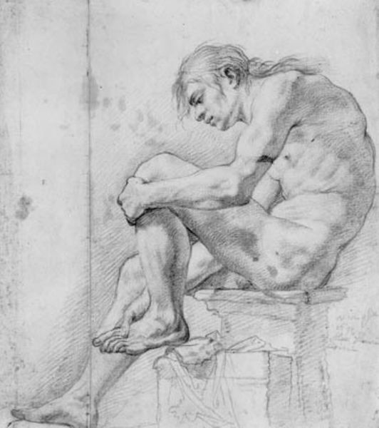Curator: Welcome. Today, we're examining "Spinario," an engraving by Giovanni Battista Piranesi. It presents a classical statue, a young boy seated and extracting a thorn from his foot. Editor: My first impression is one of surprising intimacy. The starkness of the black and white engraving emphasizes the subject's quiet, personal struggle. There's a somber mood, an interruption of the heroic, perhaps? Curator: Indeed. Piranesi, best known for his etchings of grandiose Roman architecture, here focuses on a more intimate subject. We can discuss his choice to focus on metal and the labor-intensive process of engraving as itself reflective of craft. Editor: I find the selection of Spinario fascinating precisely because it departs from grand spectacle. The thorn, that small intrusion, speaks volumes about vulnerability and the interruption of ideal forms. Its meaning expands beyond pain and injury; does the thorn stand for a corruption of sorts? A marring of the classical perfection sought during this period? Curator: That is an interesting perspective! This work offers commentary on value and purpose. Engravings, like other forms of printed matter, facilitate circulation, so his selection of this classical statue elevates it within the social fabric. Piranesi essentially reproduced classical ideals in a more accessible medium. Editor: Yet the pose of the figure recalls more profound imagery beyond just classical sculpture. Think of images of suffering--even the crucifixion--scaled down to a moment of personal physical strife. A subtle recasting, perhaps, in which even the smallest pain carries significance. I can also view this figure as the burdened Atlas. Curator: By focusing our attention on how it became an easily accessible print available on a mass scale for trade and cultural dissemination, we are able to consider the ways social boundaries were transgressed during this historical period, as high and low art became a means for dialogue and new interpretations. Editor: Piranesi invites us to meditate on classical ideals by focusing on the small, human-scale experience within this one carefully chosen statue, it creates an immediate link between grand archetypes and individual human feelings, doesn't it? It bridges the gap between symbol and everyday existence. Curator: Exactly! The engraving speaks volumes about Piranesi's capacity to highlight that shift and his astute awareness of how classical sculpture, and art itself, are material and social products of a moment in history. Editor: A very telling artwork then.