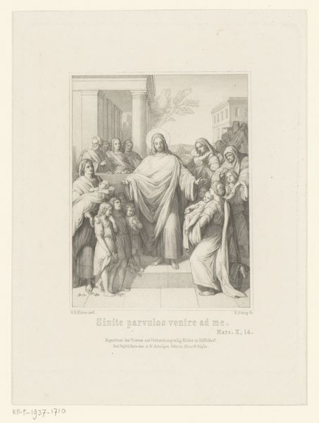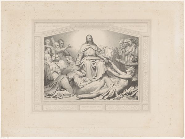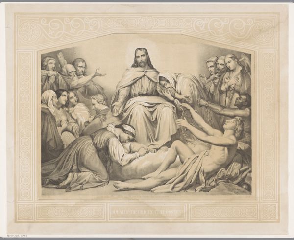 Carel Christiaan Antony Last created this print, Christus Remunerator, depicting Christ amidst a crowd of supplicants, rewarding them. The dominant visual symbol is Christ's open arms, a gesture of welcome, acceptance, and divine grace. This motif appears throughout art history, echoing images of emperors or deities bestowing blessings. Yet, the specific posture—arms outstretched, palms visible—carries a deeper resonance. Consider the ancient Roman gesture of adlocutio, where a leader addresses and inspires his troops, or the raised hands of a priest during a benediction. Here, Last's Christ offers not earthly power but spiritual solace. The supplicants mirror humanity's eternal yearning for redemption, a collective memory etched into our subconscious. Note the figure kneeling, head in hands, a universal posture of grief. This echoes the lamentations found in countless works of art, from ancient Greek tragedies to Renaissance depictions of the Passion. This pose becomes a vessel for expressing profound emotion, engaging viewers on a visceral level. The open arms of Christ, therefore, are not just a historical reference; they are a cyclical return to an archetypal image. This image resurfaces through time, continually evolving, and reminding us of the enduring power of compassion and divine acceptance.