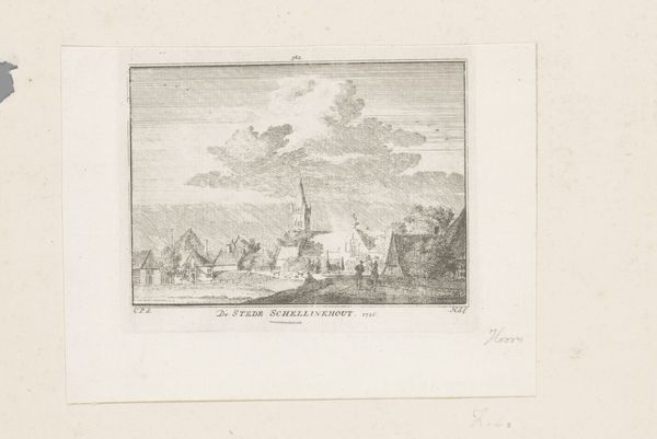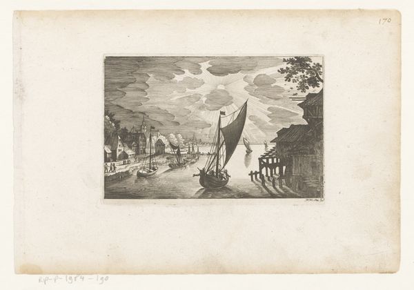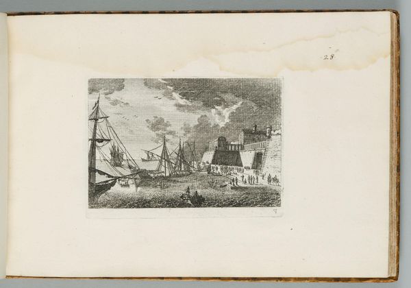 Curator: The scene captured in this print, "Gezicht op de Heimanswetering en Molenaarsbrug te Alphen aan den Rijn," is quite striking, isn’t it? Made in 1779 by Richard Brookshaw. Editor: Yes, a brooding landscape. The tonality, all in shades of grey, evokes a rather melancholic feel, almost like a memory fading at the edges. Curator: Brookshaw used etching and engraving techniques on paper to create this Dutch cityscape. What draws my eye is the intricate layering of lines; one can imagine the labour invested in producing this print for mass consumption. Editor: It's true, the technical skill is undeniable. Note the artist's careful orchestration of light and shadow and how it directs our gaze from the detailed foreground figures toward the barely-there windmills on the horizon. It speaks volumes about composition and design elements. Curator: The subject matter is crucial. Canals, bridges, and windmills were all vital to the Dutch economy and civil life in the 18th century. By mass-producing images like these, Brookshaw played a part in constructing and spreading cultural values and national pride in the burgeoning Dutch middle class. Editor: While context indeed provides greater cultural understanding, it can risk eclipsing aesthetic achievement. If we disregard all the history for a moment, we can still appreciate how the verticality of masts and bridge framework create a structural balance, mirroring one another. What could these forms possibly evoke beyond this single context? Curator: But that kind of structural reading denies this work's historicity! The artist used accessible visual language to connect his art with an audience outside the elite class. Canals here weren't merely part of a scenery, but veins of the republic’s mercantile life. Editor: I'll concede that there are levels beyond pure aesthetic engagement. But it's the combination of skilled production and a cohesive visual structure that provides this print its lasting value. Curator: I think, perhaps, we've both found unique pathways into understanding the work a bit better today, after exploring its material roots as well as its more abstracted, formal properties. Editor: Agreed. This detailed image, both artistically striking and commercially significant, provides a vivid lens through which to view 18th-century Dutch society and culture.