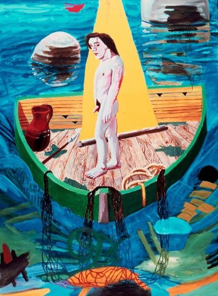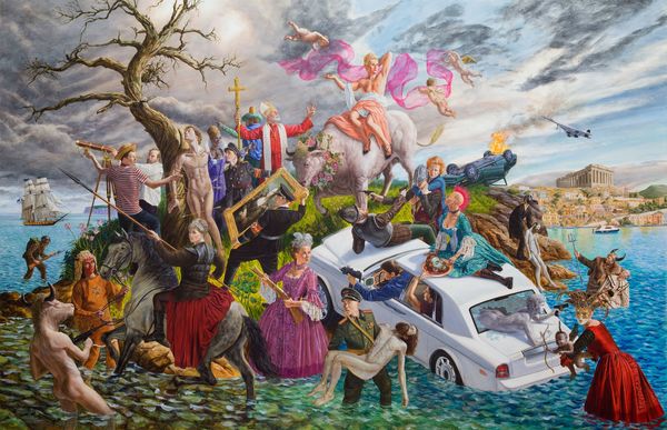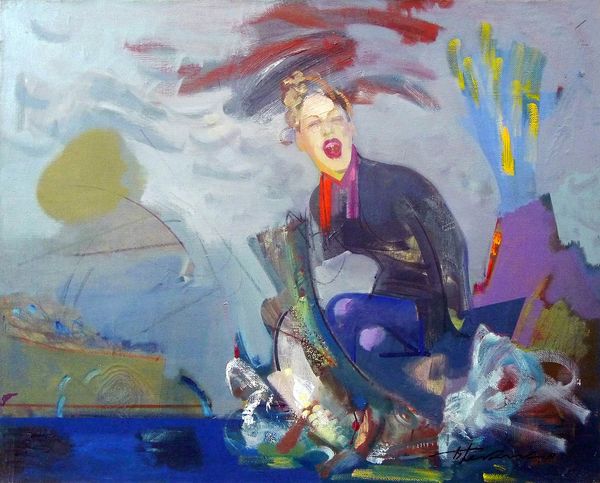 Editor: Dave Macdowell's acrylic painting, "The Wrath Of Veruca," created in 2010, is quite the dramatic scene! The characters, presumably from *Willy Wonka*, are adrift at sea on what appears to be Wonka bars. It's unsettling and surreal, the faces very expressive. What do you see in this piece? Curator: The painting employs a fascinating tension between representation and abstraction. Note the composition: a chaotic mass of figures juxtaposed against the relatively uniform wave pattern. How do the waves function not just as background but as integral to the emotionality? Editor: They really emphasize the precariousness, don’t they? The linear quality makes the image seem more artificial. Curator: Precisely! And what about the chromatic relationships? Consider the stark contrast between Veruca’s red dress and the muted blues and browns of the sea and sky. It immediately draws the eye and amplifies her emotional state. Editor: Good point. The redness stands out quite a bit. It looks like the artist focused on colour to guide viewers. Curator: Indeed. Notice too the materiality of the paint itself. Macdowell's layering creates depth, yet it retains a flatness that resists traditional illusionism. It refuses to fully commit to a realistic portrayal. Editor: So, instead of focusing on the 'why' of the narrative, we are more drawn into 'how' the visual aspects drive the mood? Curator: Precisely. It asks us to consider how colour, line, and form, not necessarily the narrative it conveys, shape our experience. Editor: This reframing of familiar material through formal qualities creates a unique viewing experience. Curator: It offers a space for us to engage with our emotions and ideas evoked purely from its structure and texture. A great perspective.