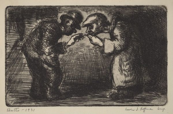 George Overbury "Pop" Hart created this etching, Poultry Man (small plate), with a direct, unadorned approach. The composition is strikingly frontal, presenting a tightly packed scene where figures and fowl vie for space. Hart's use of line is particularly noteworthy; it's scratchy, raw, and conveys texture and volume with minimal fuss. The dense hatching creates a somewhat claustrophobic environment, yet it also animates the scene with a lively energy. Hart's focus isn't on illusionism but on expression. He uses the etching needle to carve out a space teeming with life, where the characters seem caught in a moment of intense negotiation or transaction. It's the directness and immediacy of Hart's technique that give the work its distinctive character. The lack of shading or atmospheric perspective reinforces the idea that we're witnessing a scene that is less about precise representation and more about capturing a fleeting moment. The print challenges formal conventions, inviting us to engage with its raw and unsophisticated view of everyday life.