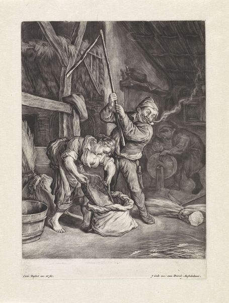 Curator: This is "Loterij van Grootebroek, 1694," an engraving by Cornelis Dusart here at the Rijksmuseum. What's your first impression? Editor: Utter chaos! Like a snapshot of absolute glee, except everyone looks just a little… tipsy. It's brimming with characters and bursting with an energy I can practically hear. Curator: Indeed! It captures a scene from a lottery announcement, a common public event in the Dutch Golden Age. These lotteries served not just as games of chance but as significant sources of revenue for local communities. Editor: Oh, interesting. It really feels like I’m stumbling into a real moment here. The light seems to dance on their faces and clothing… Curator: Dusart, who came from Haarlem, clearly sought to depict this excitement and frenzy. Look at how he used etching to emphasize particular textures—notice the detailing in clothing and even in facial expressions. The layering is superb for that effect, especially in a monochromatic work! Editor: He's definitely captured the kind of revelry where everything is just a bit too much – the raucousness and maybe the slight underlying anxiety about the odds, but mostly joyful optimism. It's infectious, like looking into a bygone party I desperately want an invite to! But do they always get this excited to hear about taxes? Curator: In a way, yes, public celebrations often coincided with important fiscal activities of a state; thus were integral aspects that unified both ruler and ruled with displays in communal cultural life, yes? Consider the lottery’s success in generating revenue at this time. By attending these festive announcements, people reaffirmed the social structure while expressing excitement with art itself playing a mediating, even conciliatory, role. Editor: Ah, so art, like laughter, making hard pills taste a little sweeter. A lot more thought was put into these announcements than I previously considered. Looking at this engraving gives you a genuine understanding, rather than merely reading accounts about those experiences; to connect back with these scenes makes for some true history! Curator: Exactly, capturing the moment within this historical lens illustrates a vital link across many components regarding seventeenth century economic activity intertwined through cultural expression. It certainly offers viewers now, through Dusart's skillful craft, a better vantage point. Editor: Absolutely. What began for me as some humorous observation shifted significantly by having that background knowledge. Suddenly I see it all now from those people's places, inside the happening, so vivid due entirely in due through this work that speaks even centuries after it came.