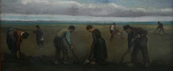 Editor: Here we have Maximilien Luce’s “Méricourt, les carrières,” painted around 1925. It looks like an oil painting. There's such a focus on labor; you can practically feel the weight and effort of those workers. What jumps out to you when you look at it? Curator: Oh, it hits me right in the gut, you know? There's this incredible grit and raw energy that vibrates off the canvas. It's not just a landscape; it's a symphony of sweat and stone. The artist, Luce, wasn’t just painting; he was channeling the spirit of the working class, turning their toil into a strangely beautiful, almost heroic, spectacle. Look at how the light catches on their straining muscles. Does that strike you too? Editor: Absolutely! It's like he's romanticizing the workers' struggles. Do you think Luce intended to make a political statement? Curator: Political, perhaps, but deeply human too. He knew firsthand what hard labor meant, which really speaks to my bones! The dust, the straining figures… it’s about resilience, dignity, even poetry etched in every line of those weathered faces. It's a tribute to the unseen souls who literally built the world. Isn't it something? Editor: It really is. I hadn’t considered the dignity in labor. I was too focused on the struggle. Thank you! Curator: And I was reminded about painting emotions through the use of realistic observation! We make a great team.