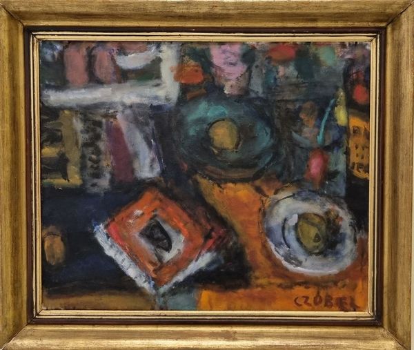 Editor: So, this is Bela Czobel’s "Interior with Chimney," painted in 1959, using oil paints. It's very abstract, almost like looking at a room through a fractured lens. What's your take on this, considering it's an abstract expressionist work? Curator: Let's look at the materials first. Czobel's use of oil paint is quite gestural here. Notice the thick impasto, how he's physically building up the surface. That deliberate materiality invites questions. What kind of labor went into this? Was it a quick, spontaneous act, or a more labored process? And how does that process relate to the representation of domestic space? Editor: I see what you mean. The textures are very pronounced. Does the medium itself carry some meaning? Curator: Absolutely. In the post-war period, the act of painting itself became a statement. The physicality of the paint, the artist's gestures—it's all part of a dialogue about the means of production. We should consider too how the chimney is treated. Not as a solid architectural element, but as an excuse for bold brushstrokes and color juxtapositions. Think about how consumerism and production influenced artists like Czobel. Was this "interior" meant to represent the anxiety of industrial society through an artistic mode? Editor: That's an interesting point. I never really thought of it that way. It almost feels like the chaotic textures represent an uneasy response to rapid societal changes. Curator: Precisely. This isn’t just a passive depiction of an interior; it's an active engagement with the materials and the social context of its time. The artmaking process itself reflects the rapid social change experienced in postwar society. Editor: So by examining his process, and the materials, we gain a better insight into the artist and cultural environment that fostered this abstraction. Thanks! Curator: It is useful to reflect on the means by which Czobel's abstract visual vocabularies relate to production processes of that era. Thank you!