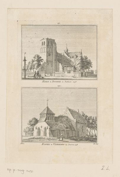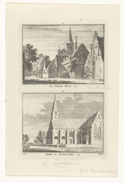 Editor: This is Hendrik Spilman's "Gezicht op Kasteel Aldegonde en gezicht op de kerk te West-Souburg, 1743," a print made with engraving on paper sometime between 1754 and 1792. The contrast is really striking! What's your read on this, seeing them together like this? Curator: Let's think about what it means to reproduce these structures via printmaking in the 18th century. Spilman isn’t just representing a castle and a church; he’s participating in a burgeoning visual economy. Who had access to these images? How did the act of engraving, this meticulous, reproducible labor, affect the value, the very perception of these buildings? Editor: So, less about the buildings themselves and more about their dissemination? The means of production influencing our understanding? Curator: Precisely. Consider the material differences between a hand-drawn sketch only a few could view and an engraving capable of wider distribution. This shift transforms architecture from unique, imposing structures to commodities circulated within a consumer culture. Think about the social hierarchies at play: who could afford these prints, and what did possessing them signify? What labour was required to create the copperplate, paper and final image? Editor: It brings a whole new dimension. I was just thinking about composition, but it is so much more that that! What sort of statements can we draw based on its materiality and its means of production? Curator: The controlled, repeatable lines of the engraving reflect an Enlightenment emphasis on order and reason, while simultaneously making those architectural visions accessible commodities for a specific class. Each impression carries with it the embodied labor of the engraver and all materials required, mediating our connection to the place. How might the image impact social identity or perhaps even be used as a social tool? Editor: That really challenges the idea of just viewing the aesthetic qualities of this print. It’s about understanding it as part of a larger economic and social machine. Thanks for the lesson! Curator: Indeed! By engaging with the material conditions of its production and circulation, we get a clearer sense of its cultural work. This isn’t just art; it’s a commodity with embedded social values and tangible labour.