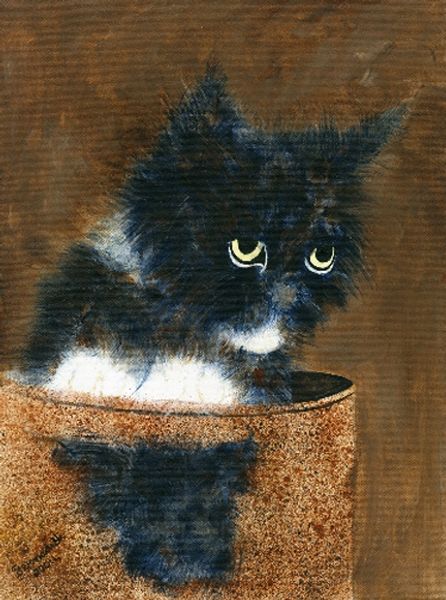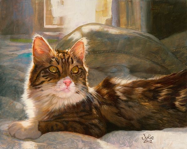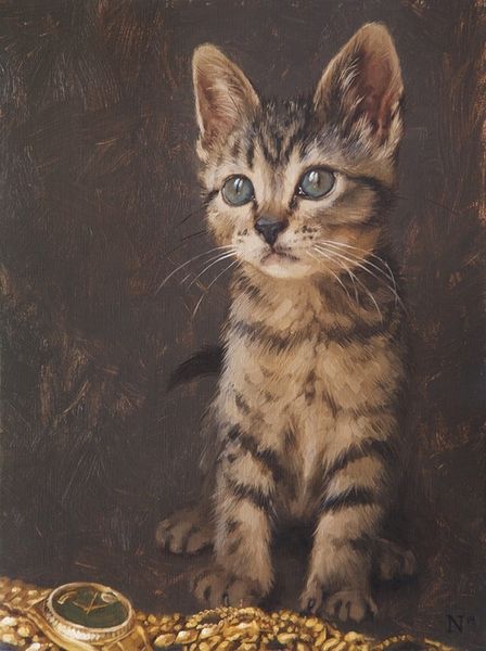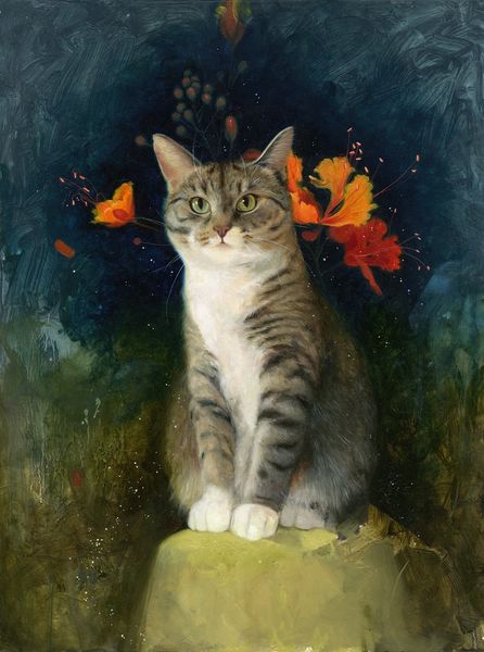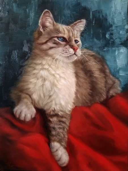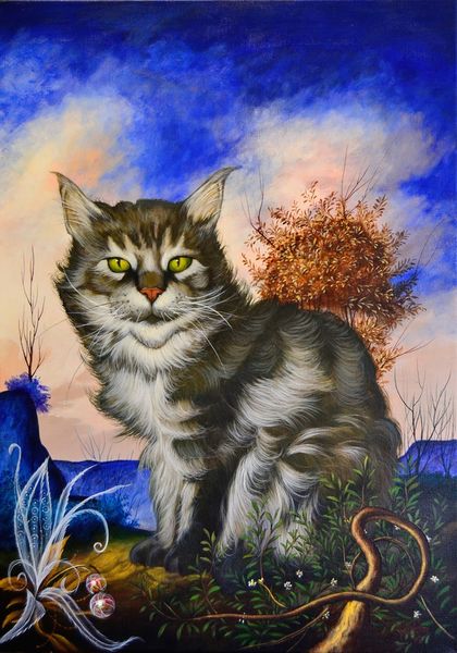 Lucia Heffernan's painting presents us with a cat in a state of total relaxation, headphones on, remote in paw, lounging on a blue sofa. In this piece, Heffernan continues a distinctive style of endowing animals with human traits, and humorously mirroring human experiences through their imagined lives. The cat, usually representing independence, is here recast in a pose of utter domesticity and leisure. The red ball of yarn is a symbolic detail, suggesting a rejection of traditional feline activities for the ease of modern entertainment. Perhaps Heffernan is playfully commenting on societal shifts towards passivity, mediated experiences, and the blurring lines between human and animal lifestyles. The painting invites us to reflect on our own habits and the ironies of modern comfort.