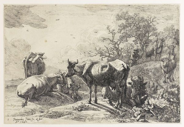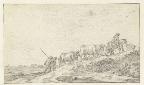 Curator: This pencil drawing, titled "Cattle Driver with a Group of Cattle," was created by Jean Bernard sometime between 1775 and 1833. It's currently housed here at the Rijksmuseum. Editor: It has such a raw, immediate feel. The textures conveyed just through pencil – the roughness of the hides, the implied vastness of the landscape – is really evocative. It is an era of romanticism, where landscapes and themes depicting the working class become common. Curator: Absolutely. Bernard captures a certain truth in the daily labor, especially significant in the Dutch landscape tradition. Think about the availability of pencils at this time and its effect on art making. Were they mass-produced, locally made, readily available, and how did they change the field compared to charcoal, which was commonly used at that point? Editor: It also forces us to consider the socio-economic backdrop. Rural life in the late 18th and early 19th centuries in the Netherlands would have been very dependent on agrarian labor and the social position of the farmer. I wonder how much that influenced the public appeal and market for these types of pastoral images, perhaps tapping into romanticized visions. Curator: It’s interesting you mention appeal. One of the main uses of landscape art depicting workers was exactly for propaganda purposes, such as in soviet realism later on. However, at the time the art world did not include them as a significant genre until romanticism took hold. Editor: Yes, exactly. And even within what might appear like simple rural scenes, we must think about how social hierarchies and economic realities might be subtly represented and perhaps reinforced through artistic choices. Were there biases reflected? For instance, who were the audiences that visited places like the Rijksmuseum at the time? And how were these working-class citizens seen? Curator: Food for thought for sure. Examining drawings like this helps us to comprehend not only how art has evolved with changing materials, but also to interrogate its cultural implications across history. Editor: It leaves me with questions about our connection to landscape.
