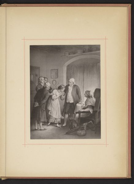 Editor: This is a reproduction of "Reproductie van een ontwerp van een vrouw die terecht staat," made before 1908 by A.W. Elson & Company. It is a print, probably an engraving, on paper. The image is striking, almost theatrical, with a clear sense of injustice. What social narratives were being built around scenes like this? Curator: That's an interesting observation. Considering the period and the academic art style, such depictions often served to reinforce or critique contemporary social and legal structures. The scene presents a woman on trial, surrounded by male authority figures. Were these images meant to legitimize the justice system, or perhaps to question it? I am curious about the specific historical context that Elson & Company was referencing when creating this print. Were similar legal dramas common subjects? Editor: Possibly, especially if we read it as a criticism. How might its presentation—the fact that it's a reproduced print, not an original painting—factor into its message and its impact? Curator: Ah, the mode of reproduction is crucial. Prints allowed for wider circulation, making the image more accessible. What social commentary does that accessibility enable? It transforms what might have been a singular statement into a readily available object, one that could become part of debates around justice, gender, and power dynamics that play out within that period's court systems. Do you see other examples of its dissemination or popular interpretation? Editor: I hadn’t considered its wide availability that way. Thinking about the original context and audience for this work helps me to appreciate the depth and layered intent behind what appears to be a simple print. Curator: Indeed. Understanding the interplay of art and social history reveals much more than what meets the eye on the surface of this compelling artwork.