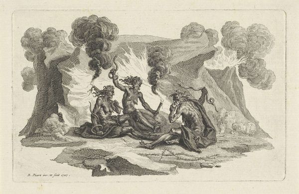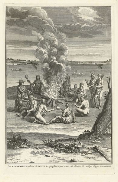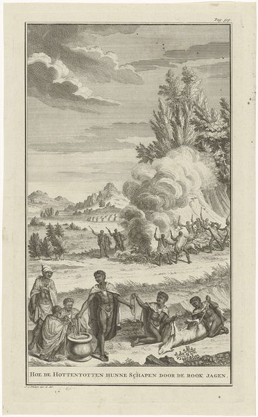 Curator: This engraving, made by Matthijs Pool in 1727, is titled "Khoikhoi smelten en bewerken ijzer"—Khoikhoi smelting and processing iron. It resides here at the Rijksmuseum. What are your first impressions? Editor: The scene strikes me as somewhat idyllic, even serene, despite the fiery activity depicted. There's a certain detachment in the way the engraver presents this depiction of labor; it’s almost like watching a carefully choreographed performance rather than witnessing industrial activity. Curator: That detachment, I think, speaks to the work's function as a form of early ethnography, shaped by Dutch Golden Age sensibilities. It isn't just about depicting labor, but about classifying, recording a "foreign" practice for a European audience. See how the engraver meticulously details each step, almost diagrammatically. Notice the sequential numbering to further reinforce an “objective” study of an iron smelting process. Editor: Precisely! It reminds me of similar depictions of colonial life meant to justify or frame imperial projects through supposed scientific accuracy. Are these “objective” studies ever free from projecting inherent prejudices? This raises many questions about representation, doesn’t it? The romanticized landscape in the background adds another layer to that narrative; a sort of untouched paradise made more civilized via industry. Curator: It does invite such critique, definitely. Look, however, at the symbolic weight iron held cross-culturally. The ability to work with iron represented a significant technological and societal leap. Pool's decision to foreground it connects the Khoikhoi people to narratives of ingenuity and skill, even as his rendering remains filtered through a European lens. And notice how, through posture and musculature, the human figures possess an intrinsic vitality—one which can, through our contemporary reading, combat some of the possible depersonalization of their depicted labor. Editor: That’s an interesting counterpoint. I think this artwork serves as a strong reminder to always analyze historical portrayals within their specific political and social contexts. It also shows how loaded imagery can be—it's both a record and a re-presentation with so much more between those layers. Curator: Indeed. The work becomes a mirror reflecting not only its subject but also the evolving values of those who gaze upon it through the centuries.