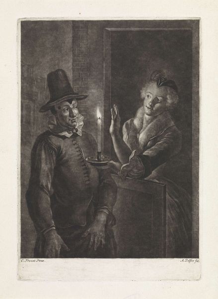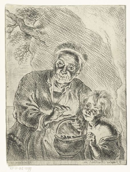Curator: This piece, dating roughly from 1645 to 1705, is titled "Old Woman and a Boy with Candles," currently residing at the Metropolitan Museum of Art. It's rendered in printmaking, a drawing really, though the artist remains anonymous. The figures seem lit from within. Editor: Yes, it’s the contrast that immediately strikes me. The figures emerge from a dark, grainy background—it's not merely illumination but the raw, etched lines that give form to their faces and clothing. Curator: Exactly. Note the intricate hatching and cross-hatching, techniques to model form and create depth, particularly around the old woman's face, emphasizing its wrinkles, but also in the draping fabric of their clothing. Editor: Which leads to the process—I'm curious about the labour involved in achieving such detailed lines. Think about the hours spent etching on the metal plate to create this luminosity. It's a very labor-intensive medium that served to represent domestic light and its accessibility. Curator: Indeed, the light is paramount, isn't it? The faces are revealed in this soft, flickering glow. Notice how the positioning and juxtaposition creates visual rhythm between the two figures—each with a shared illumination. Editor: I read a sense of dependency within it, too. Who makes the candle, what materials were required to make it, and what is it burning to fuel are all questions of access and daily life that would reveal much about this period. Curator: It certainly allows for multiple interpretations; one might suggest this careful modulation symbolizes knowledge and passing the torch between generations, as implied through their interactions. Editor: Right. Thinking about the wick and wax though gives it an undeniable materiality—a candle transforms the physical to the ephemeral—fueling a social and even material encounter with their world through candlelight. Curator: Well, however you look at it, light animates these anonymous subjects—elevating this genre scene into something quite thought-provoking in both technique and affect. Editor: Absolutely—pondering its laborious construction makes you see the picture in a whole new light, revealing connections far beyond mere depiction.