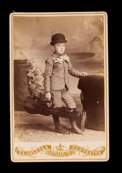 Curator: This is an untitled cabinet card photograph by Edwin A. Bass, currently residing in the Harvard Art Museums. It depicts a full-length portrait of a child. Editor: It has such a somber feel, doesn't it? The sepia tones and the child's rather serious expression create a sense of melancholy. The stiff dress and the hat seem almost costume-like. Curator: Yes, the dress might indicate a specific social identity or even a symbolic representation of childhood innocence, now lost through the impersonal technology of photography. Think of how clothing defined one's place. Editor: I'm struck by the backdrop, which appears to be painted. The contrast between the manufactured setting and the child's real, material presence is quite striking, and of course the photographer's details are included on the card. Curator: Notice how the child's gaze, even obscured by the hat's shadow, meets ours. It's an invitation across time, a small human reaching out. Editor: And the physical card itself, the heavy paper stock, speaks to the labor involved in creating and possessing such an image. It was a commodity, a thing to be displayed and consumed. Curator: A tangible memory made visible, a symbol captured for generations to come. Editor: A reminder of the complex layers embedded within even the simplest photographic artifact.