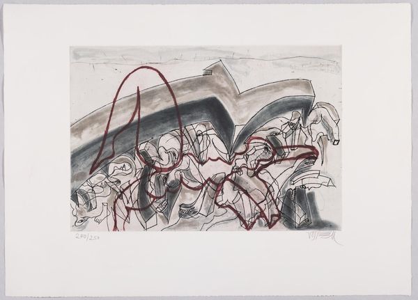 Editor: Here we have Feliks Topolski’s "Speakers’ Corner," a chaotic scene rendered with swift, energetic lines. It feels like a snapshot of a fleeting moment. What story do you think Topolski is trying to tell? Curator: Ah, Topolski! A true chronicler of his times. For me, this piece sings of free expression, that beautiful, messy human need to be heard. It's almost a dance, isn't it? Editor: A dance? I hadn’t thought of it that way! Curator: Look at the lines, so fluid, so alive. Imagine the cacophony of voices, the gesticulating arms. He captures not just the scene, but the *feeling* of Speakers' Corner. That scribbled, almost frantic energy... it’s the sound of London, isn't it? Editor: Yes, I see that now. It's less a portrait and more a feeling. Curator: Exactly! It’s a reminder that art isn’t always about perfect representation, but capturing the soul of a place, a moment, a people. We all have a voice, don't we? Editor: It definitely makes you think about the power of speaking out. Thanks!