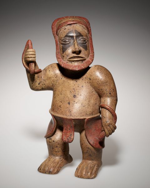 Editor: Right in front of us we have a Moche ceramic piece, dating from around 100 to 500, entitled "Jar in the Form of a Figure with Painted Head, Large Earflares, and Feline Headdress." It feels incredibly regal. How do you read this sculpture? Curator: Well, let’s consider the function of such a vessel. Moche ceramics weren’t mere decoration; they served vital roles in ritual and elite society. This particular jar, given its depiction of a figure adorned with elaborate earflares and a feline headdress, likely represents a high-status individual or a figure of authority, maybe a ruler or a priest. What does the feline headdress evoke for you? Editor: Power, definitely, maybe a connection to the spiritual world? I guess I just think of powerful rulers and their connection with animals... Curator: Exactly. The feline was a powerful symbol in Moche cosmology, associated with strength and supernatural abilities. Representing an individual with such regalia speaks volumes about the power dynamics and social stratification of Moche society. Moreover, these vessels were often found in burial contexts, implying their significance in the afterlife. It forces us to ask questions: who had access to these objects, what rituals did they participate in, and what narratives were these objects trying to communicate? Editor: That’s fascinating. So it’s less about pure aesthetics and more about understanding its role within a specific historical context? I'm trying to relate this to other forms of portraiture across different cultures, too... Curator: Precisely! By understanding its societal function, we can avoid imposing modern notions of art onto a culture with vastly different values. Do you think understanding the historical context affects your appreciation of the art? Editor: Definitely. I feel like I’m seeing the figure for who it really is—a symbol of Moche power—rather than just as an ancient sculpture. Curator: I find that a more thoughtful way of considering historical imagery can shift perceptions, broadening what art can be and what purposes it can have, don't you think? Editor: I think I have a greater appreciation of how interwoven politics, status, and artistic representation are after considering this piece.