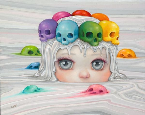 Editor: Here we have Camilla d’Errico’s "Fishbowl," created in 2017, using mixed media. There’s such a strange serenity to it, despite the riot of colours and unusual combination of objects. What stands out to you? Curator: It's a potent image, isn't it? D'Errico taps into a wellspring of visual language. The "fishbowl" itself acts as a multifaceted symbol. Fish, often associated with the unconscious and dreams, combined with the bowl’s restrictive form suggests containment, even observation. What kind of cultural echoes do you pick up? Editor: I guess the big-eyed figure feels almost manga-esque, like something from Japanese pop culture. Then, you have the more classical, portrait-style rendering of the face, with almost photorealistic textures, making her unsettling gaze very prominent. Curator: Precisely! This juxtaposition is key. The large eyes are a common trope, signaling vulnerability or heightened awareness. And look at the creatures perched above! Each one acts as a talisman, a repository of cultural meaning. Do you find their placement arbitrary or deliberately symbolic? Editor: They seem precariously balanced. I’m unsure if that's intentional, although the fish and octopus continue the water motif. Perhaps they are aspects of the figure’s personality, or even desires and struggles she suppresses. Curator: Wonderful. So, by blending styles and employing resonant symbols, d'Errico speaks to our collective memories, triggering diverse cultural touchstones within each viewer. Editor: That makes me think about how art can be a kind of mirror, reflecting our own internal worlds through recognizable symbols. Curator: Exactly. We can view the personal within the archetypal, to realize how powerfully these archetypes resonate.