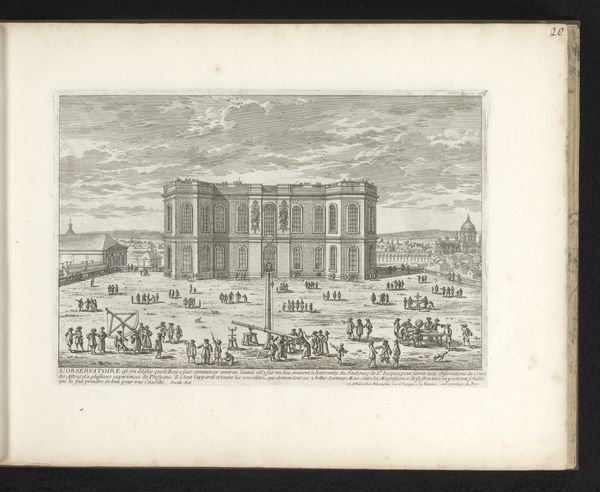 Curator: Let's discuss this print by Adam Perelle, titled "Gezicht op de façade van de Tuilerieën," which roughly translates to "View of the facade of the Tuileries," created sometime between 1660 and 1695. Editor: My immediate impression is one of bustling activity, but rendered with such rigid, almost mathematical precision. The facade dominates, but it's the intricate patterns of movement below that really capture the eye. Curator: Absolutely. Consider the historical context—this image wasn’t just a landscape. The Tuileries represented the absolute power of the French monarchy under Louis XIV. This print, circulating widely, broadcast that power to a broad audience. The ordered activity is not just incidental; it reinforces the sense of control and grandeur. Note the architecture itself, the carefully positioned windows, and the dome, creating visual hierarchies of power. Editor: From a formal perspective, I’m drawn to the use of line. It's incredibly detailed, almost obsessive in its rendering of architectural elements and the figures. Look at how the artist uses hatching and cross-hatching to create a sense of depth and volume, especially on the façade. Curator: And that relates directly to the social implications. The architectural details were not merely aesthetic choices. The opulence, the scale – all functioned as signs of divine right, a visual language intended to impress and, frankly, intimidate. Furthermore, this viewpoint isn't neutral; it’s positioned to emphasize the dominance of the palace. Editor: True. The composition is very controlled. There's a clear foreground, middle ground, and background, each meticulously delineated. It directs your eye to follow a certain path, always leading back to the palace itself. I wonder if this was produced to be included in larger projects to consolidate the King's identity. Curator: Exactly! This image reinforces the status quo, embedding itself within a complex network of cultural production designed to sustain the King's image. Understanding it allows us insight to the power structures of the 17th century. Editor: Ultimately, it’s this tension between artistic technique and the embedded ideology that makes this seemingly straightforward cityscape so compelling. Curator: Agreed. It’s a testament to how even seemingly objective representations can be powerful vehicles for conveying specific cultural and political messages.