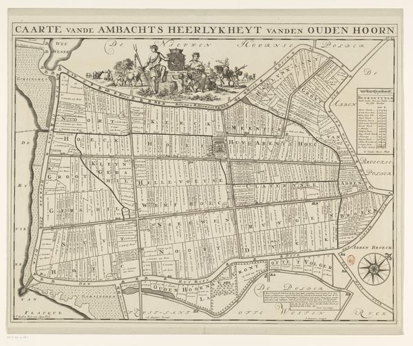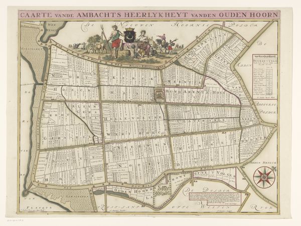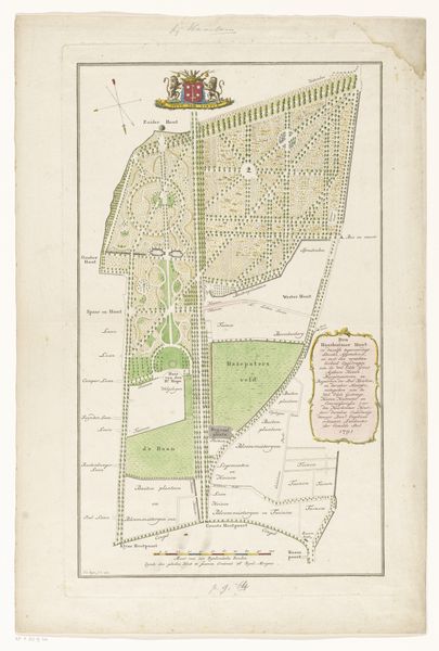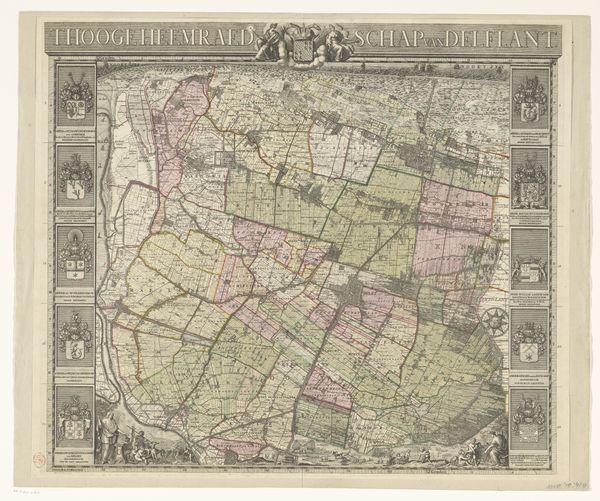 Editor: This is "Kaart van de heerlijkheid Abbenbroek," a drawing by Jan Stemmers from 1701. It’s incredibly detailed for something so old! The pastel colours give it almost a whimsical feel, but it's obviously a very functional map. What do you make of it? Curator: Maps are fascinating cultural artifacts. Beyond simple navigation, they are coded with symbols that embody power, ownership, and worldview. Look closely at the crest; it’s not just decorative, but a potent claim to authority, visually broadcasting who governs this "heerlijkheid," or dominion. Editor: The crest looks... unusual. Are those shoes? What do they signify in this context? Curator: Ah, that’s precisely the kind of question to ask! Crests often bear charges—symbolic elements—unique to a family or region. The shoes might allude to a foundational story, a local industry like shoemaking, or perhaps a pun on a family name. These symbols tap into cultural memory, creating continuity between past and present. It asks "what did they intend to communicate to their world?" Editor: So it’s more than just a landmark locator, it tells a story. How might people viewing this in 1701 have read it differently than we do today? Curator: For them, every boundary line, every carefully labeled plot would have carried weight related to property, obligation, and local identity. Today, divorced from that immediate context, we see it more as a historical record and artistic creation. Editor: I guess it shows that art truly reflects how we want the world to see us, and not just how we see it. Thank you! Curator: Indeed. Maps, seemingly objective, are always infused with the biases and aspirations of their creators, constantly being reinterpreted and rediscovered through different lenses over time.
