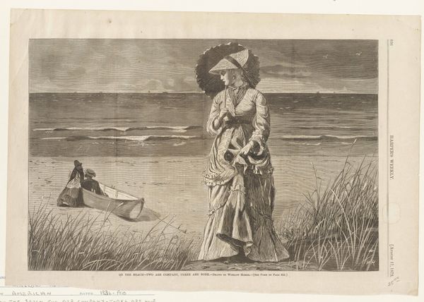 Winslow Homer's 'On the Bluff at Long Branch' is an engraving on paper, a medium that lends itself to the detailed depiction of social scenes. At first glance, your eye is drawn to the composition which is structured around a series of vertical and diagonal lines. These lines create a sense of depth, and also divide the scene into discrete zones of activity. The foreground is dominated by figures whose forms seem to blend into the landscape. Then, moving to the middle ground, the beach is populated with tiny figures, all meticulously rendered. The formal structure suggests a semiotic exploration of leisure and social dynamics. The artist's choice to focus on the forms of the figures as structural elements hints at a commentary on the structures that organize social life. The work invites us to consider how meaning is produced through the arrangement of forms. It challenges the notion of fixed meaning and encourages an ongoing dialogue between the artwork, its context, and the viewer.