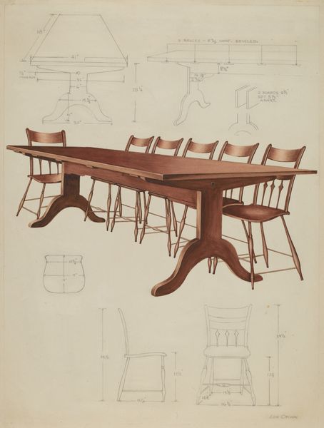 This Meal Bench was conceived by George Fairbanks, though we don’t know exactly when. The drawing shows a simple structure built from planks and roughly hewn legs. What’s most interesting is that the image is, in fact, a design rendering. It evokes the Shaker aesthetic, in which plainness was next to godliness, but it also presents a set of instructions. The bench would have been made with basic woodworking tools – saw, plane, perhaps a drawknife to shape the legs. The entire object comes down to joinery, how the parts meet. Note that the legs are tenoned through the tabletop and secured with wedges. Though the design is straightforward, it takes skill to execute. We could think of this bench as a vernacular design: that is, a prototype developed by an individual, but equally a product of collective knowledge. It shows us how design ideas can be shared and adapted, always retaining a sense of utility and the maker's touch.