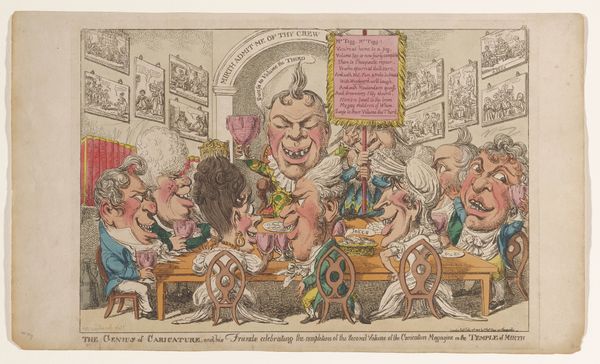 Charles Williams created this hand-colored etching titled "Napoleon opgeserveerd" in 1813. It’s a British satirical take on Napoleon's declining power during the Napoleonic Wars. The print visualizes European leaders as diners preparing to devour Napoleon, who is presented as a dish on a platter. This reflects the political climate of the time, as various European powers were uniting against France. The artist employs visual codes to portray Napoleon as diminished and vulnerable, contrasting with his earlier image of invincibility. Made during a period of intense political upheaval, the print is not merely a humorous image. It's a commentary on power, politics, and national identity. British printmakers often used caricature to shape public opinion, and this work is a great example of that tradition. To fully understand the print, historians would need to research the political alliances, key figures, and popular sentiments of the period. The meaning of art is always contingent on its social and institutional context.