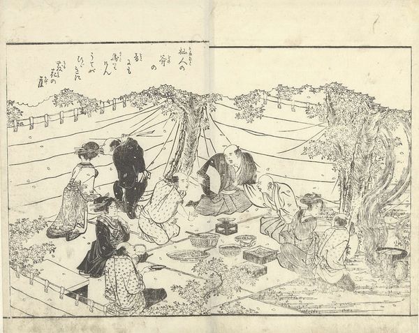 Curator: This is a page from "History of the Hidden Protection in Japan and China," a book by Katsushika Hokusai, born in 1760. The illustrations use fine lines. The book is held at the Harvard Art Museums. Editor: It feels like a chaotic story unfolding, full of tension. The line work and composition have a restless energy. What kind of hidden protection is being depicted here? Curator: The narratives draw from both Japanese and Chinese cultural contexts, depicting various methods of self-defense, both physical and spiritual. We might consider these scenes as survival tactics reflecting societal anxieties. Editor: The sword imagery is unavoidable. I see how culturally, the sword isn't just a weapon, but a symbol of status, power, and even spiritual attainment. What does it mean to have it used as a tool for protection? Curator: In the context of Hokusai’s era, these images might reflect the socio-political unrest, the constant struggle for power, and the vulnerability of different social strata. Editor: Reflecting on it, the symbolic depictions give a glimpse into the historical and cultural values of these societies. Curator: Exactly, and that’s how visual art carries cultural memory and continuity.