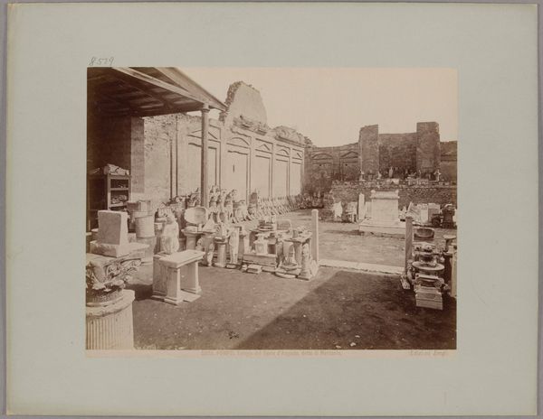 Curator: This photograph by Giacomo Brogi, dating from around 1880 to 1890, shows a view of the peristyle in the Domus Vettiorum, Pompeii. The image is an albumen print. Editor: It has such a serene, almost ghostly feel, doesn't it? The warm tones soften the stark ruins. I'm immediately struck by the heavy shadow work contrasting with areas brightly exposed with natural light that must've saturated this courtyard. Curator: Indeed. The albumen process allows for incredibly fine detail. Brogi likely saw value in documenting the space at the domestic scale in order to allow access through commercial photographs that were made readily available to traveling, largely elite, European audiences at the time. Think about the labor involved in creating these prints versus painting or even other early photography methods! Editor: Absolutely. And when we talk about that audience, consider the cultural context: the fascination with classical antiquity interwoven with the colonial gaze. Viewing these remnants not just as archaeological sites, but symbols of empire and legacies of power and how that power was made accessible for consumption via mass printing and sale. Curator: The framing is also deliberate, directing our eyes toward the repeated verticals of the columns. I am really appreciating his strategic placement. These would've originally been spaces for commerce and conversation among working peoples that inhabited Pompeii at the time. It causes a strange kind of dissonance within my sensibilities when viewed within its contemporary conditions as essentially now vacant property under tourist watch. Editor: And even more jarring given what we know transpired there. We look at these aesthetically pleasing ruins, partially rebuilt and preserved, but the history embedded within those materials speaks to a cataclysmic event, which also has political meaning, the fragility of life and systems of governance that would allow such an occurrence to wreak utter havoc on communities and their structures of living. Curator: The photograph's texture invites consideration of not just Brogi's methods but the history of Pompeii's excavation and preservation. We get the weight of the materials, what these prints communicate across time. Editor: Precisely. The Domus Vettiorum presented through Brogi's lens serves as a quiet testament to interconnected history, consumption, power, and human resilience, captured within a specific cultural context and distributed widely in the same process. Curator: I think looking at this photo reminds us how material processes have contributed to both access to, and shaping perceptions of, the past, but that the historical social conditions continue to affect its use. Editor: Definitely. It compels us to consider what stories we continue to circulate and which voices we amplify within them.