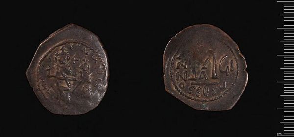 Curator: Here we have a "Coin of Herakleios" created by Abd-al-Malik of the Umayyads. It's fascinating to consider how this object embodies cultural and political shifts through iconography. Editor: The worn texture of the coin is striking. It feels almost heavy with history, doesn't it? I'm interested in the metalwork, the specific techniques they used. Curator: Absolutely. The imagery, though eroded, hints at a complex negotiation of power. Consider how existing Byzantine symbols were adapted or repurposed to assert new authority and potentially negotiate identities. Editor: The coin's weight, 12.63 grams, tells its own story. What specific materials were used, and how did that choice speak to the available resources and trade networks of the time? Curator: Examining this coin allows us to discuss larger questions of cultural hybridity and the formation of new identities in the wake of conquest and religious transformation. Editor: Each coin was a testament to the labor and materials used. Studying its creation reveals much about the era. Curator: Indeed. This unassuming coin unlocks conversations about the intricacies of cultural exchange and power dynamics. Editor: Yes, an object whose form and substance reveal so much about its complex making.
