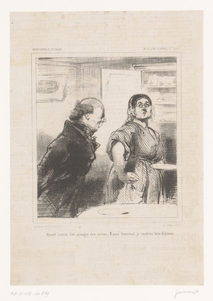 Editor: This lithograph by Honoré Daumier, titled "Check the market...Are our stocks rising?", depicts two men intently reading what looks like a financial newspaper. They seem anxious. How would you interpret this work within its historical context? Curator: Daumier's work often critiques Parisian society, especially the bourgeoisie. Consider the rise of financial speculation in 19th-century France. How might this image reflect anxieties about economic instability and the changing social landscape? The figures appear caricatured, almost grotesque; what statement do you think Daumier is making? Editor: So, it's less about the individuals and more about a broader commentary on the era’s financial culture and its impact on society? Curator: Precisely. This piece speaks to the democratization of the art market and how prints circulated political and social critiques to a wider audience. It's fascinating to consider how Daumier used art to engage with and shape public opinion. Editor: I see it now. It's like Daumier is using humor to address some deeper societal issues. Curator: Exactly! It's a powerful way to make a statement and encourage viewers to think critically about their world.
