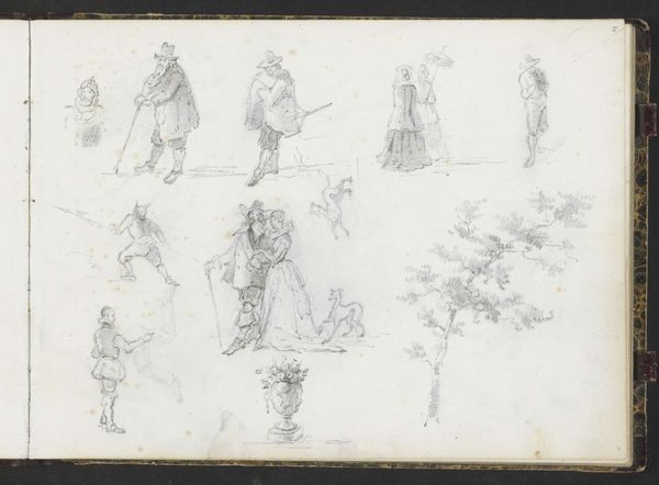 Lambertus Lingeman created this drawing, which appears to be a page from a sketchbook, using graphite or a similar medium. The composition consists of various figures scattered across the page, giving a sense of spontaneity. Lingeman's marks create a range of figures in different activities, from people walking and carrying items to others gathered near a gateway. Note how the artist uses line quality to define form and space. The varied densities create a sense of depth while the rough lines capture movement and the ephemeral nature of everyday life. The lack of a clear focal point encourages the eye to wander, engaging with the scene and its elements. It destabilizes traditional notions of composition, suggesting that value can be found in fragments of the everyday.