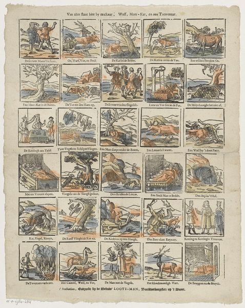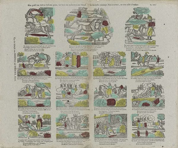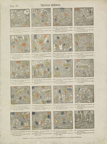 This print, made by Erven de Weduwe Jacobus van Egmont, presents a series of vignettes within a grid-like structure, each offering glimpses into the world of the East Indies. The composition relies on simple, almost childlike renderings, where the rudimentary use of line and space creates a sense of depth. The scenes, segmented into rectangular frames, use minimal color, which gives the print a stark, documentary feel. This formal simplicity belies a complex interplay of cultural signs. Each panel is a signifier, pointing to a network of colonial encounters and the exotic 'other.' The linear structure of the print, therefore, acts as a tool of categorization, imposing a European order on the perceived chaos of the East. Consider how the composition of each scene—figures positioned against a backdrop of simple landscapes—invites us to decode a narrative of exploration, encounter, and perhaps, exploitation. The print uses form to assert a particular worldview, one that sees and interprets the East through a lens of Western expectations and power.