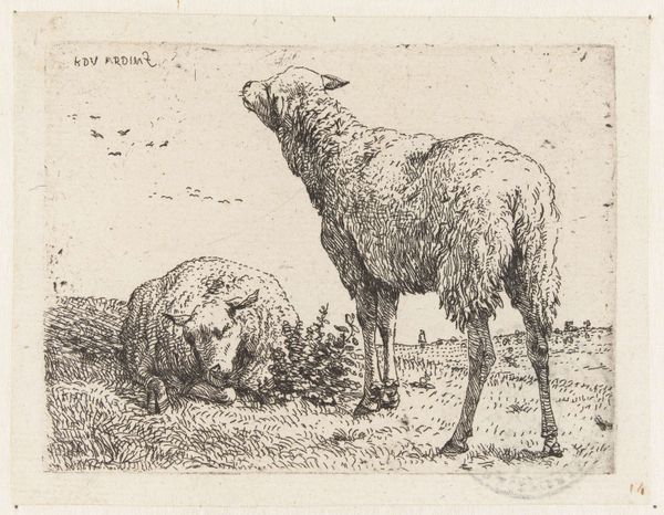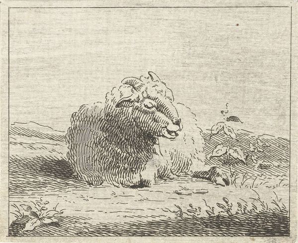 Curator: Looking at this print titled "Sheep and Flies" by Karel Dujardin, I am struck by its somewhat melancholic mood. Editor: Yes, the scene has a somber quality despite depicting such a pastoral subject. The flies almost act as a memento mori. Curator: Dujardin, active in the Dutch Golden Age, often depicted pastoral scenes, but this one feels different. The sheep seems burdened. Editor: The flies might symbolize annoyance or decay, but perhaps they also represent transformation, a part of the cyclical nature of life and death. Curator: The prominence of the flies could signal societal concerns about disease, hygiene, or even spiritual corruption during that period. Editor: Or, simpler, the flies could point to the fleeting nature of earthly existence, a common vanitas theme. Curator: This artwork, with its seemingly simple depiction, provides insights into the life and concerns of the time. Editor: Indeed. A quiet piece, buzzing with subtle meanings.