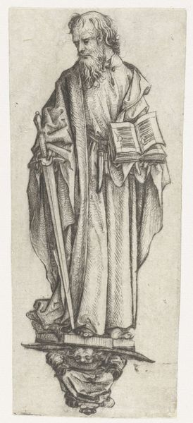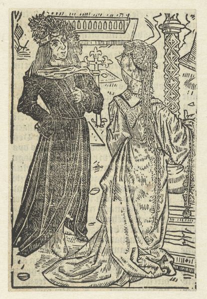 Curator: Here we have "Twee Spaanse geestelijken," or "Two Spanish Clergymen," an engraving from the period of 1596 to 1630, attributed to Claes Jansz. Visscher, currently residing at the Rijksmuseum. Editor: Initially, this work reads as a portrait capturing two individuals of stature; the detail given to their garments, rendered in the stark contrast typical of engravings, implies this. There’s a formality to it but something feels off-kilter as if a tension exists within this small world. Curator: Well, look closer and you'll notice it subverts conventional portraiture norms. Although seemingly depicting clergymen in their elaborate robes, the inscription “Es faemina Biscaia” at the bottom gives this an odd twist— suggesting that the clergy members may actually be Biscayan women in disguise! Editor: Ah, I see! That throws everything into a different light. Suddenly, the focus shifts from religious status to gender and identity play. The piece engages questions of power dynamics through representation. We must now consider if these are women masquerading or perhaps, something else entirely? Curator: It's exactly that tension—the social and perhaps even political commentary inherent in such role-playing—that I think Visscher intended to capture. Gender transgression during this time period carried enormous implications for societal norms. Editor: Yes, the subtle defiance is captivating! The strict linearity of the print contrasts sharply with the complexity of the narrative that could be suggested. Looking at it from a contemporary view, I'm reminded of how historical images of those who challenged expectations often survive through subversion and code. Curator: Absolutely. And within the Rijksmuseum's collection, it continues to speak to enduring issues around identity, representation, and the fluidity of social roles over time. Editor: I agree. Seeing through that lens—the masquerade, and who benefits—adds nuance, provoking thoughts about power, performativity, and identity that resonate even today.