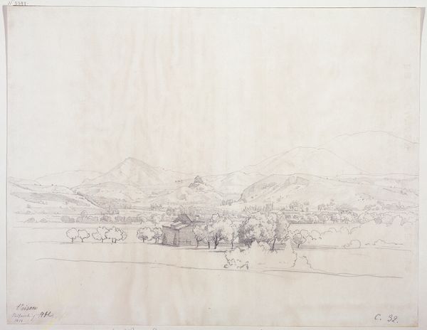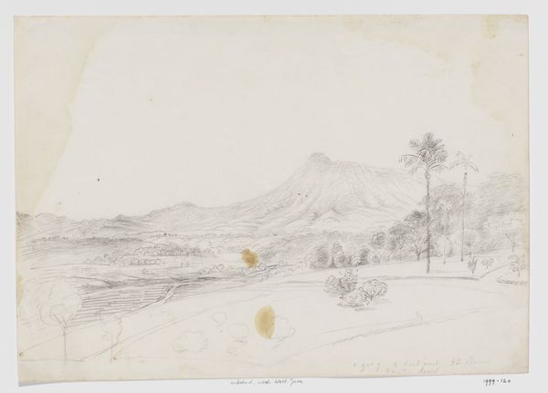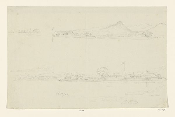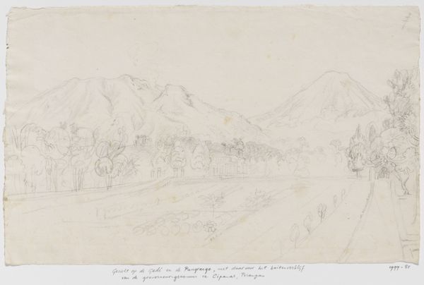 Curator: We're looking at "Gezicht op dorp en berglandschap, Java," or "View of a Village and Mountainous Landscape, Java" by Adrianus Johannes Bik, dating from around 1816 to 1846. Editor: It’s a muted piece, almost ghostly. The composition seems simple at first glance—horizontal bands creating recession from a low-lying foreground up to the mountainous background. It exudes an air of tranquility but also feels unfinished, vulnerable almost. Curator: Indeed, it is largely defined by that horizontal structuring. Observe how the delicate pencil work renders depth, with a clear delineation between the planes: the land and then mountains in the background. Notice the interplay between light and shadow across those peaks. Editor: The mountain range is striking. Mountains often symbolize stability and permanence, but here they are almost sketched in, which seems more transient. The village, huddled beneath them, what might that symbolize, especially in contrast to the raw energy suggested by those volcanoes? Is there perhaps, some suggestion about protection and providence or anxiety and foreboding for the settlers? Curator: It's fascinating how you read the mountains symbolically. Focusing on the structure again, I find it interesting how the artist creates visual rhythm. He employs subtle shifts in tonal values of greyscale to create atmospheric depth. Also, the linear progression, though simplified, adheres to established academic landscape principles of the time. Editor: Looking closer, there are multiple styles being represented here—a very tentative touch, unfinished etching. And perhaps even watercolor application in certain sections of this mixed-medium drawing. Was the artist perhaps struggling between formal realism, and, perhaps more subjective feelings? Curator: Perhaps. Ultimately, Bik uses simplification to convey a sense of place. I find the subdued tonality key here. The absence of dramatic contrasts flattens the landscape and almost subdues the overall scene in the pencil tones. Editor: I agree. It’s not a glorious vision, but a quiet contemplation on nature, human presence, the ever-shifting moods, perhaps a bit wistful for us who may observe colonial rule and its uneasy relation to those powerful geologic underpinnings that seem destined to endure forever. Curator: Precisely. It offers, if not answers, than interesting prompts for further analysis and discussion when regarding landscape art of the colonial period in the east.