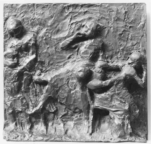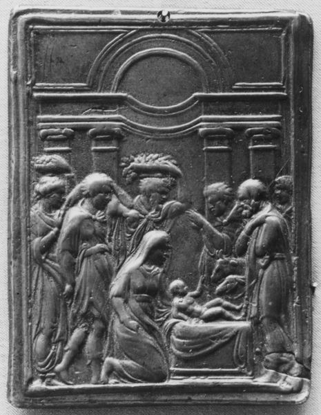 This Entombment scene was made by Monogrammist CB sometime between 1550 and 1700. It is a small, rectangular relief in metal; probably pewter or silver. The image is skillfully rendered, with a range of textures and details, achieved by hammering and chasing the metal from both sides. The production process would have required careful planning, and a deep understanding of metalworking techniques, including repoussé and chasing. The artist has created a rich sense of depth and volume, with the figures appearing to emerge from the background. The choice of metal as a medium adds to the work's solemnity, as the material itself is associated with mourning and remembrance. The small scale of the relief suggests that it was intended for private devotion, rather than public display. Ultimately, this Entombment highlights the importance of craft in conveying meaning and emotion. By focusing on the materials and processes used to create the work, we can better appreciate its artistic and cultural significance.