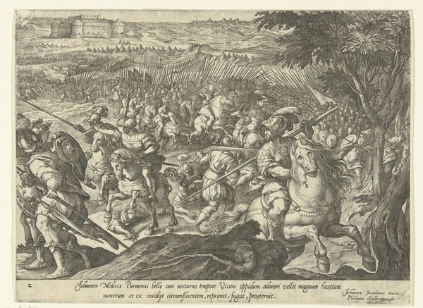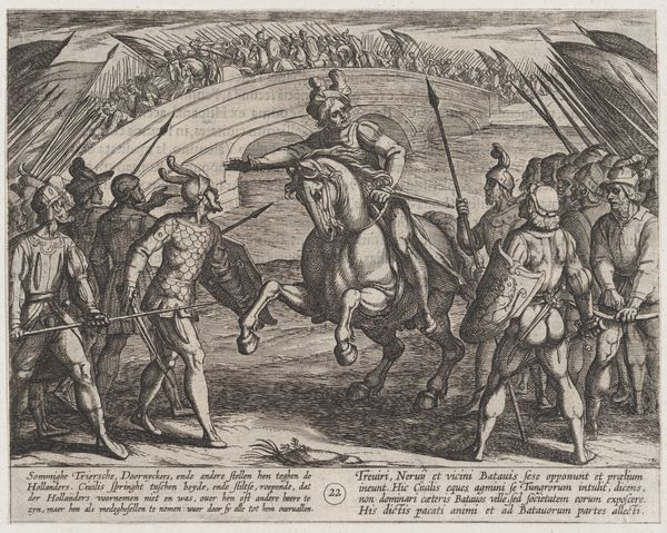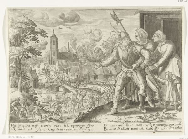 Editor: Here we have "Carnavalsoptocht," a print dating around 1625, created by an anonymous artist, and held at the Rijksmuseum. It feels so chaotic, a whirlwind of figures and strange costumes. What do you see in this piece, in terms of its composition and the use of line? Curator: What strikes me is the artist's masterful use of line to create a sense of depth and movement. The figures, though grotesque, are meticulously rendered. Notice the density of lines in the foreground compared to the more sparsely rendered background. It creates a recession into space, even without sophisticated shading techniques. Are you drawn to any particular aspect of this contrast? Editor: Yes, the details in the foreground, like the costumes made of barrels, are so intricate, compared to the blurs of figures further back. The balance is almost unsettling, pulling your eye back and forth. How would you describe the formal qualities that achieve that? Curator: I'd emphasize the strategic repetition of shapes - the circular forms of the barrels echo in other elements, uniting disparate parts of the composition. The density of line also plays a role, establishing a visual rhythm, if a frenetic one, leading to what is a disturbing symmetry. The artist created compositional unity by emphasizing these structural relationships, despite what appears, initially, to be a disorganized scene. Editor: I never would have thought of it as unified! So the lines and shapes work together in this interesting tension. Thanks, that’s given me a whole new way to look at it. Curator: Indeed. It encourages us to explore its artistry, rather than being overwhelmed by the narrative.